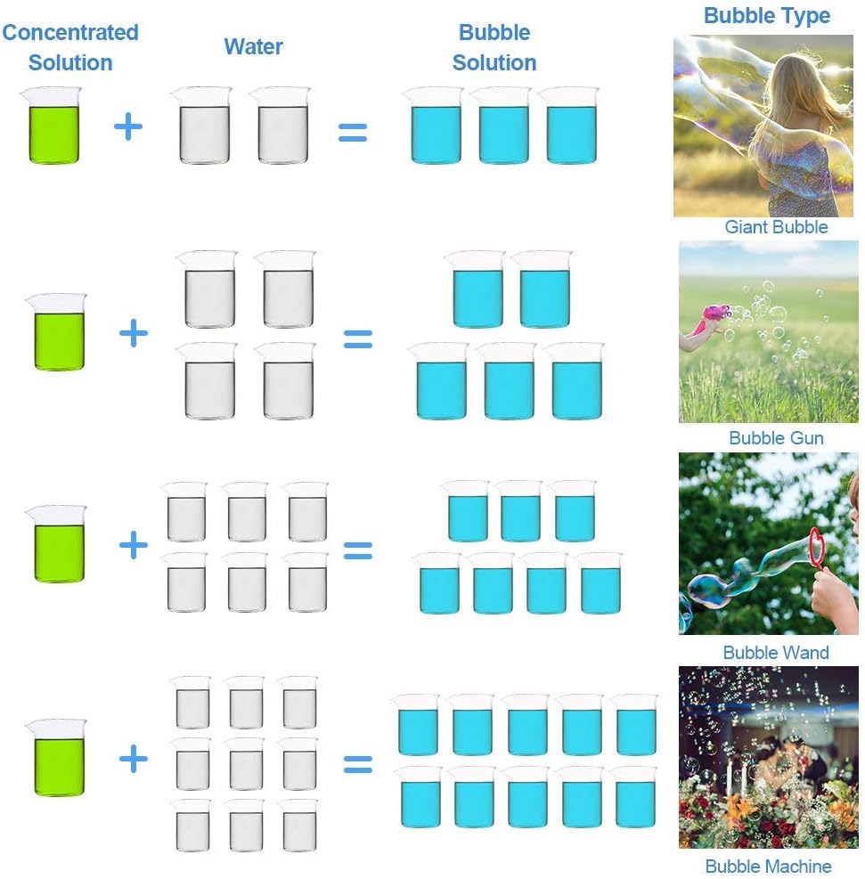 • 🌈 To Get Different Bubbles: 1L Lulu Home bubble concentrated solution can be diluted to 2.5 Gallon. ifferent proportion will get you different bubbles. For example, 1 cups of Water + 2 cups of concentrated solution = bubble solution for Giant Bubbles(for more proportion, please refer to the picture or the product description below).